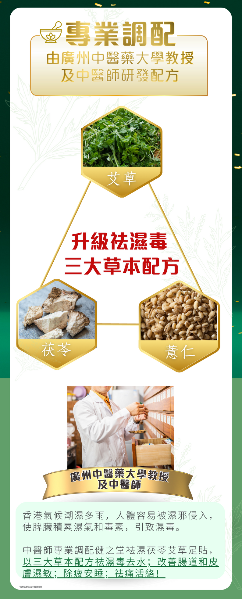 而最近有種祛濕毒嘅方法受中醫師強力推薦!就是使用健之堂祛濕茯苓艾草貼!係香港人最需要的養生產品‼️ 🥼由中醫藥教授及註冊中醫師親自調配✨